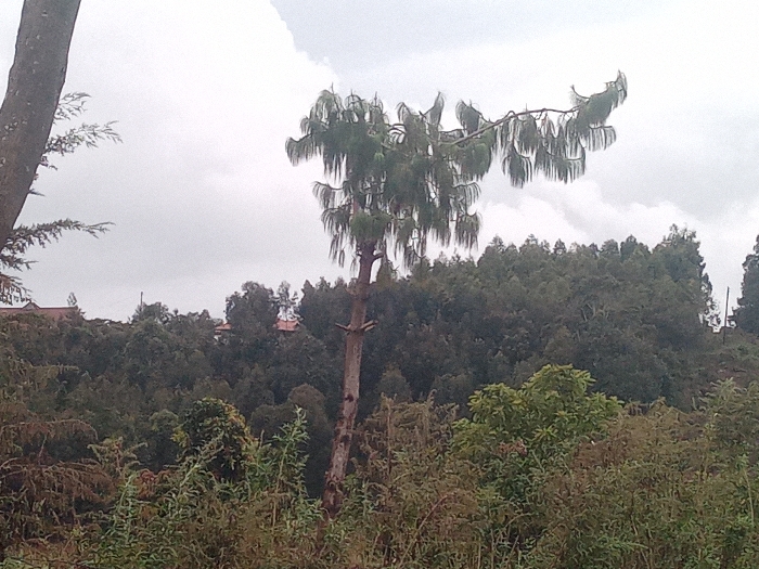 The scene depicts an outdoor landscape in Limuru Central ward, Kenya, under an overcast sky. The foreground is composed of dense shrubbery and smaller trees with mixed green and brown foliage. In the mid-ground, a tall, slender tree with a light brown trunk and long, drooping green needles from its upper branches stands centrally. A portion of a thicker tree trunk with some attached foliage is visible on the far left. The background features a dense expanse of dark green trees, forming a canopy that extends towards the horizon. Within this distant tree line, several structures with reddish-brown roofs are partially visible. No individuals or specific actions are observed.