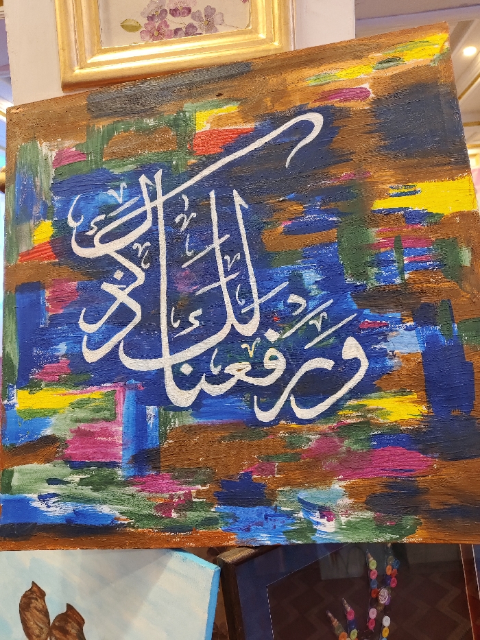 The image displays a vertically oriented rectangular artwork featuring white Arabic calligraphy on an abstract, multicolored background. The calligraphy, prominent in white, reads "ورفعنا لك ذكرك" (Wa Rafa'na Laka Dhikrak). The background consists of broad, textured brushstrokes in shades of dark blue, brown, yellow, green, red, and magenta. The artwork is presented in an indoor setting in the Blue Area, Pakistan, likely an art exhibition or gallery. Above the primary artwork, a portion of a gold-framed piece depicting pressed purple flowers is visible. Below, to the left, a segment of a light blue canvas with brown shapes is present. To the right, part of a framed item under glass showcases numerous small, colorful, circular objects. No individuals are depicted.