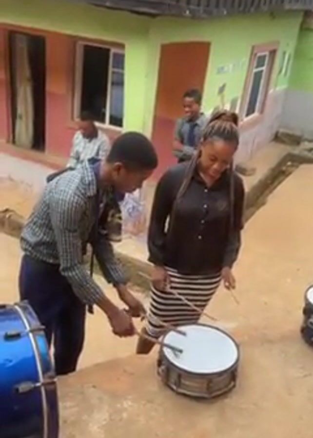 group of young people outdoors in what appears to be a schoolyard. Several are playing drums, including a snare drum and a blue bass drum. A woman in a black top and striped skirt stands near one of the drummers, seeming to encourage him. There are buildings with painted walls in the background and other individuals observing the drumming.