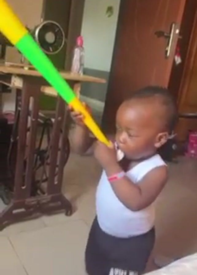 - "A toddler stands in a room blowing into a yellow and green plastic horn, known as a vuvuzela" by FM-1UjHE2, licensed under CC BY 4.0