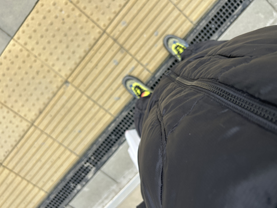 The image displays a first-person, downward view of an individual standing in a public pedestrian area. The subject wears a dark-colored, likely black, quilted puffer jacket with a visible vertical zipper. Below the jacket, two feet are visible, clad in grey athletic shoes with prominent neon yellow-green accents. The ground consists of light brown or beige square tiles, featuring both parallel-ridge and raised-dot tactile paving patterns. A black metal drainage grate runs horizontally across the mid-ground, adjacent to a light grey concrete or stone curb on the left. A small, indistinct white object is partially visible at the far left edge of the frame. No specific visual identifiers within the image directly confirm the location as Zimnitsa, Bulgaria; however, the scene depicts elements consistent with a modern public walkway or station platform.