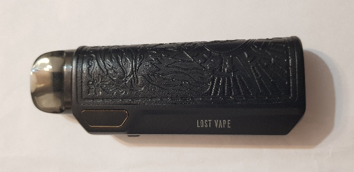 - "A single black Lost Vape brand electronic vaping device is depicted horizontally on a plain, light-beige or off-white surface" by FM-acgRD3, licensed under CC BY 4.0