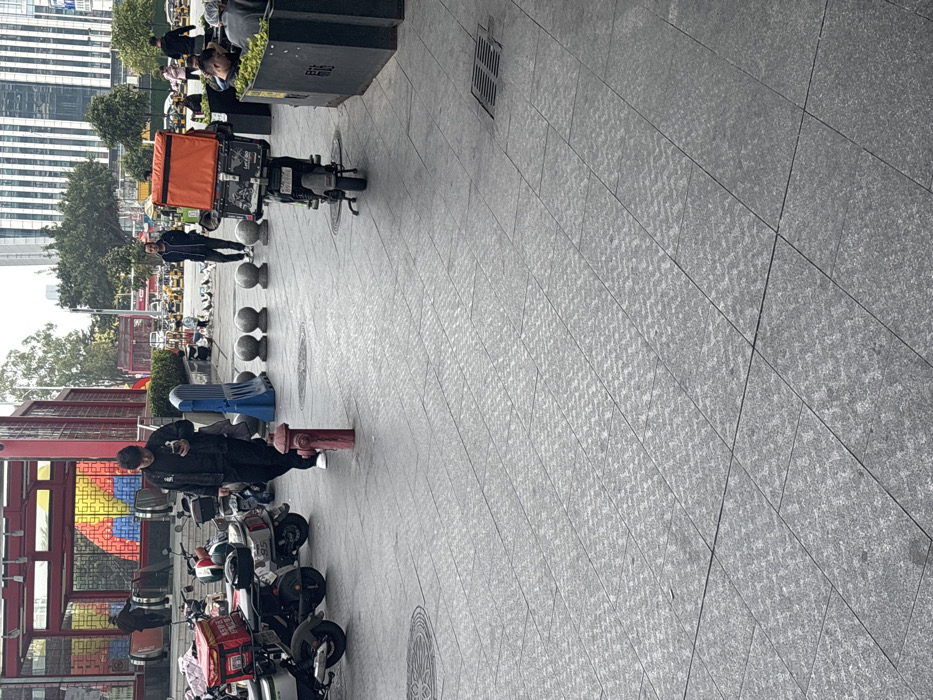 A sidewalk scene shows pedestrians near delivery bikes, some with orange boxes. A man in black stands by a red fire hydrant and parked scooters. Spherical bollards line the walkway. In the background, a building is visible. The sidewalk is paved with large, textured gray tiles. A grate is set into the pavement.
