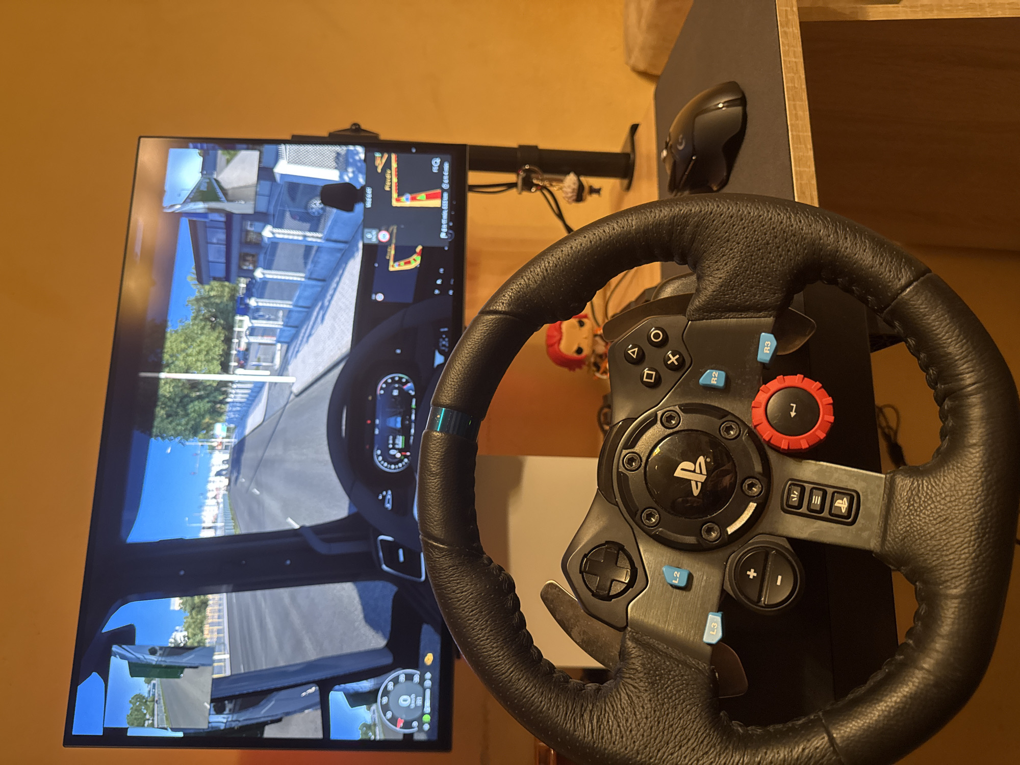 gaming setup with a steering wheel in the foreground and a monitor displaying a driving simulator in the background