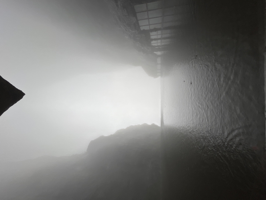 A monochromatic, hazy scene, possibly of a mountainous landscape, dominates the image. Visible are the obscured shapes of hills and cliffs, vanishing into the fog. Contrasting sharply on the right is a dark, textured vertical surface, reminiscent of a wall with water trickling down it. The upper part features a gridded structure, likely window panes, also dimmed by the pervasive mist.