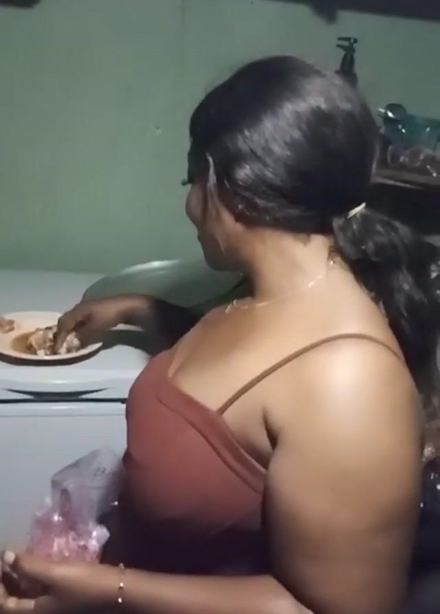 A woman stands in what appears to be a kitchen. She is wearing a maroon tank top with spaghetti straps and has her dark hair pulled back in a low ponytail. She picks up a piece of food from a plate on top of a white refrigerator and eats it. In her other hand, she holds a plastic bag. The kitchen has light green walls and a shelf above the refrigerator.