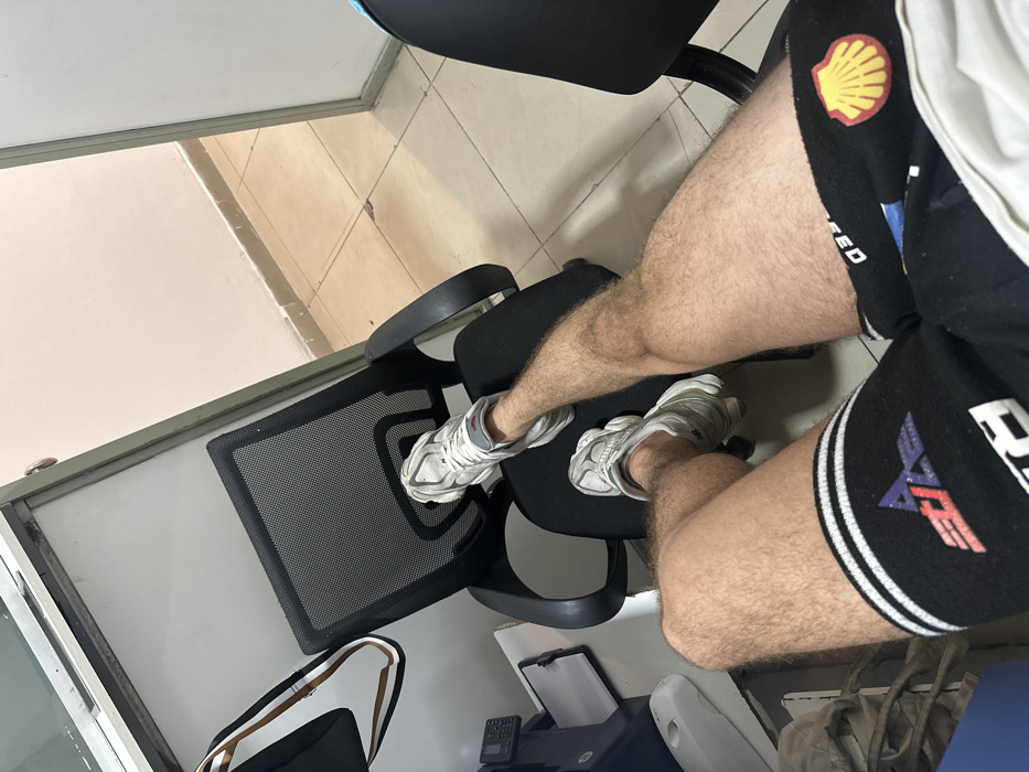 A person sitting in a black office chair with their feet propped on another chair. The individual is wearing white sneakers, black shorts with a white trim, and a white shirt. Logos visible on the shorts include a Shell emblem and another indecipherable logo. The floor is tiled, and office equipment such as a printer are visible near the base of the chair. A bag hangs from the side of the first chair.
