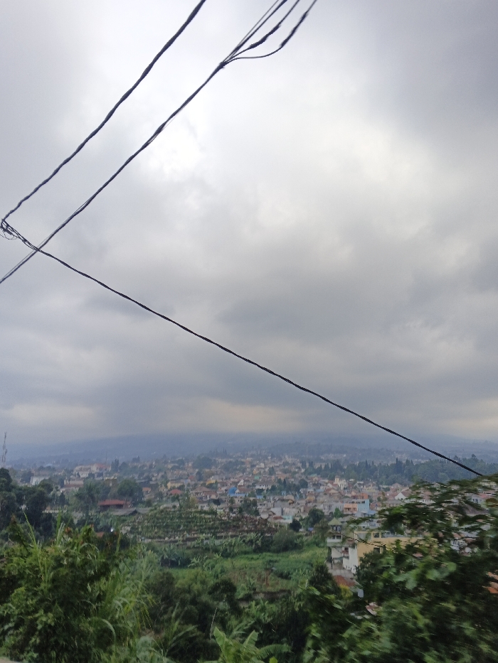 The scene is located in the city of Xiulin, Taiwan, and depicts a panoramic view from an elevated position under an overcast sky. The upper third of the frame shows a uniform expanse of grey clouds. Multiple dark utility wires traverse the upper foreground, some appearing loosely bundled. The midground features a dense residential area composed of numerous buildings with varied colored roofs, integrated with green terraced agricultural fields. Lush green foliage, including shrubs and broad-leafed plants, fills the lower foreground, with visible motion blur on the right. Distant mountains or hills, partially obscured by atmospheric haze, establish the background horizon.