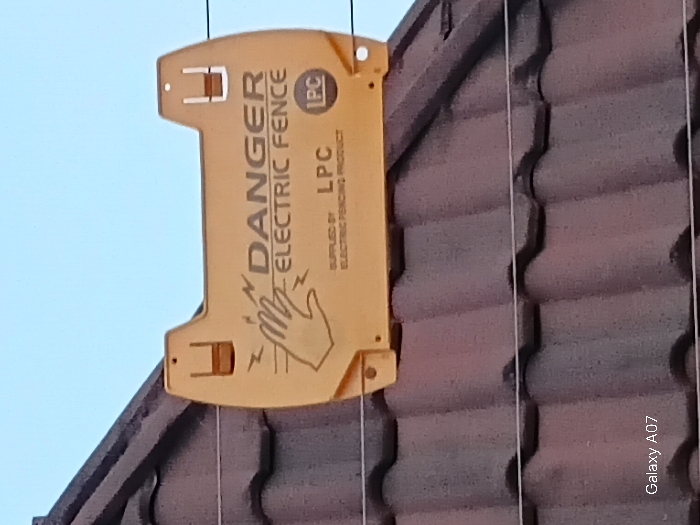 An eye-level shot features a yellow warning sign for an electric fence, with black lettering reading "DANGER ELECTRIC FENCE" and an icon of a hand receiving an electric shock. The sign also includes "LPC" and "SUPPLIED BY ELECTRIC FENCING PRODUCT". It's attached to a fence running along a roof with brown, textured tiles. Thin wires are visible. The lower right corner has "Galaxy A07" printed on it. The background shows a light blue sky.