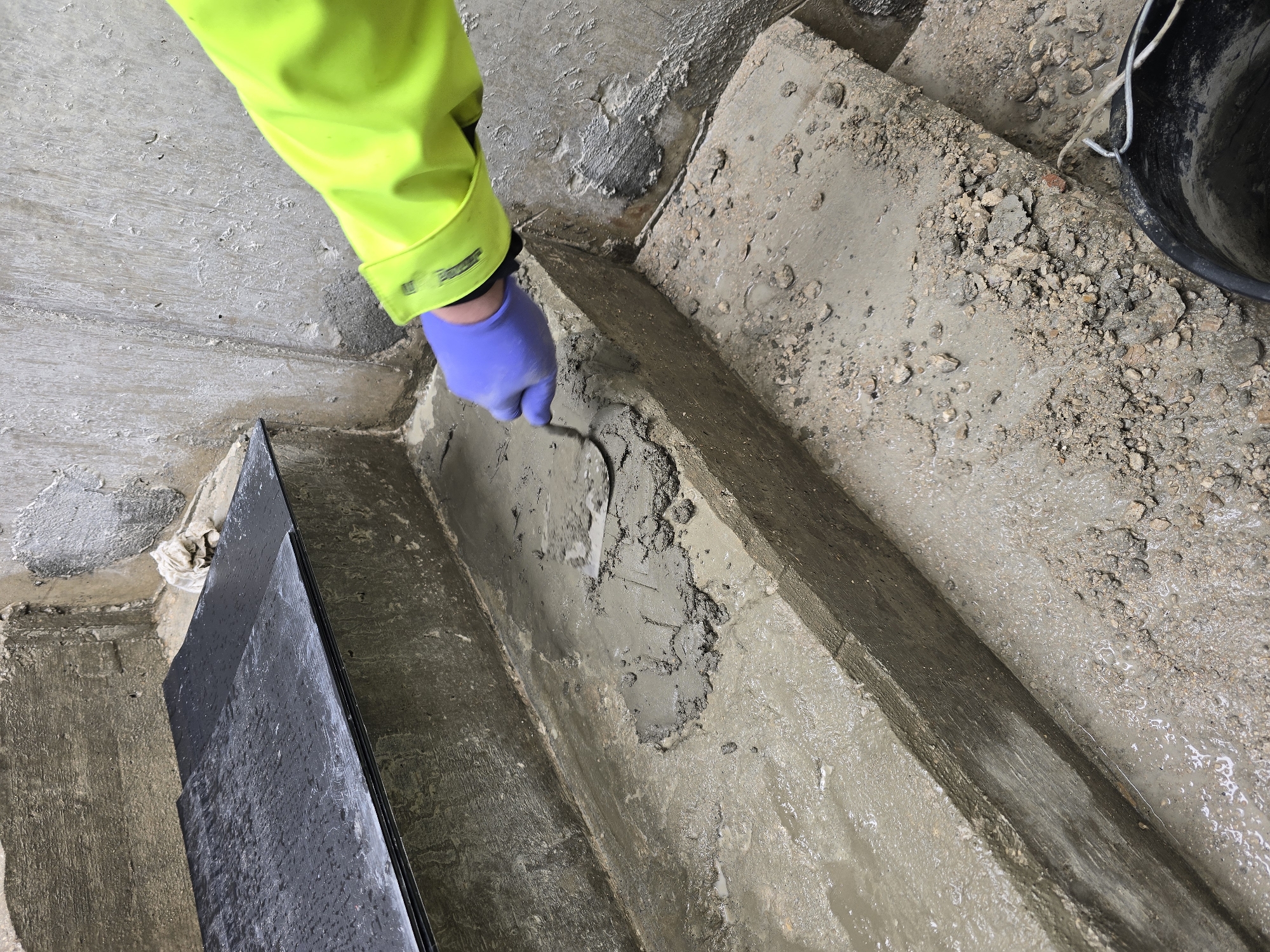 - "person wearing a neon yellow jacket and a blue glove troweling grey mortar into a crack on a concrete surface" by FM-VT8K93, licensed under CC BY 4.0