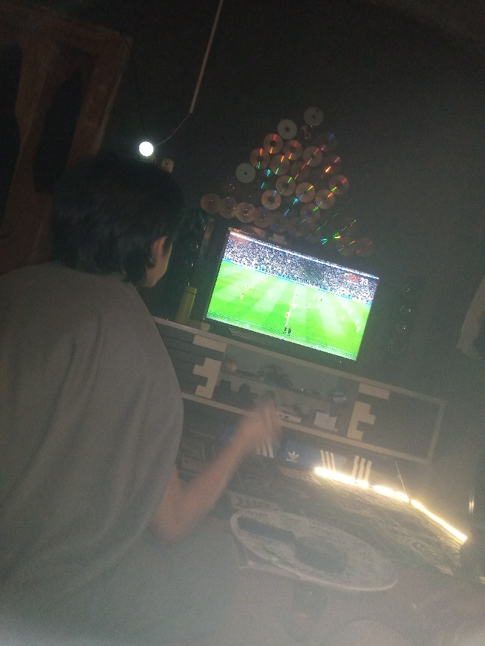 An individual, visible from the back-left with dark, medium-length hair and wearing a grey t-shirt, is seated in a dimly lit indoor environment in Ciherang, Indonesia. The person's right arm is slightly blurred, suggesting movement. Directly in front of the individual is a brightly illuminated monitor displaying a soccer (football) match, showing a green field with players and spectators. Above the monitor, a single circular light source is visible, and to its right, numerous compact discs are arranged on a dark wall in a triangular configuration, reflecting light with iridescent colors. Below the monitor, a desk or shelf unit is present. A dark bottle stands to the left of the monitor on the desk. A black item bearing an "Adidas" logo is situated on the desk. A horizontal strip of warm LED lights illuminates the foreground of the desk, where a white-framed, disc-shaped object resembling a racket or frisbee is partially visible.