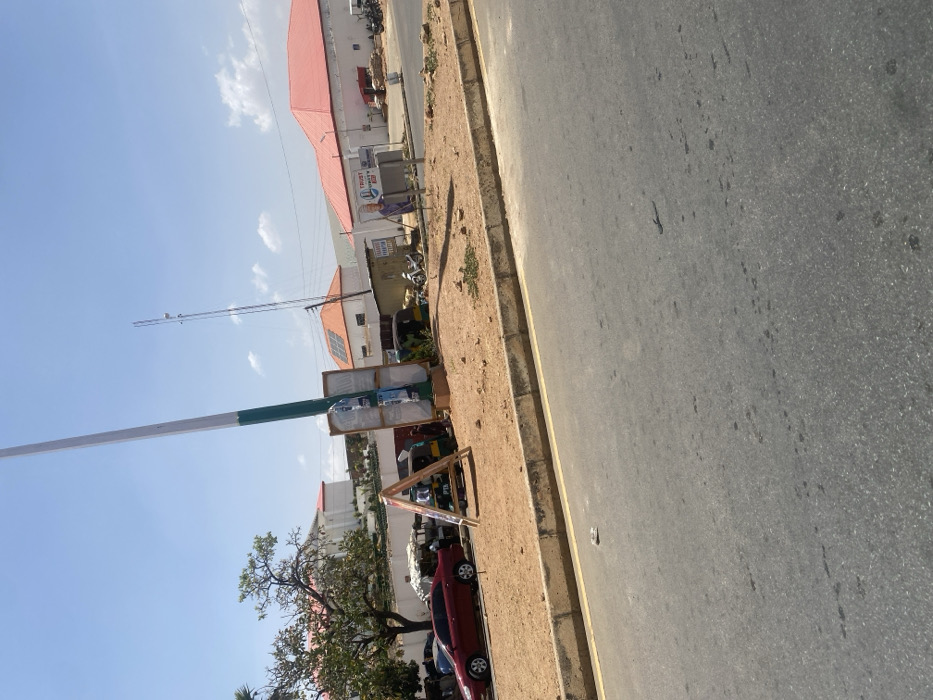 This image depicts an urban scene at the Polo Roundabout in Jos, Plateau State, Nigeria, under a clear blue sky with minimal cloud cover. In the foreground, a gray asphalt road occupies the lower portion of the frame, bordered by a concrete curb topped with dusty, reddish-brown earth. A small, dark, unidentifiable object lies on the road surface. The midground features a prominent, tall, round pole painted in alternating white and green sections, positioned on the unpaved ground. At its base, an improvised kiosk-like structure composed of several vertical panels wrapped in clear plastic is visible, displaying obscured information or advertisements. A wooden A-frame sign, partially obscuring the word "PTA," stands nearby on the ground. To the left of the pole, a dark red sedan is parked facing left on the unpaved shoulder, behind which several motorized tricycles (Keke Napep) are clustered, alongside what appear to be market stalls or shaded waiting areas. To the right of the pole, an advertising board featuring a person's image and the text "TRUST FUND" is erected. Minimal human figures are discernible near the kiosk and parked tricycles, suggesting ongoing activity. In the background, a series of buildings with white or light-colored walls and distinct red or orange-red corrugated iron roofs are visible. One building exhibits solar panels on its roof. A tall, slender metal mast, likely a telecommunications tower equipped with multiple antennae, stands against the sky. A large tree with green foliage provides shade on the far left. The overall environment appears dry and dusty, characteristic of a bustling urban center.