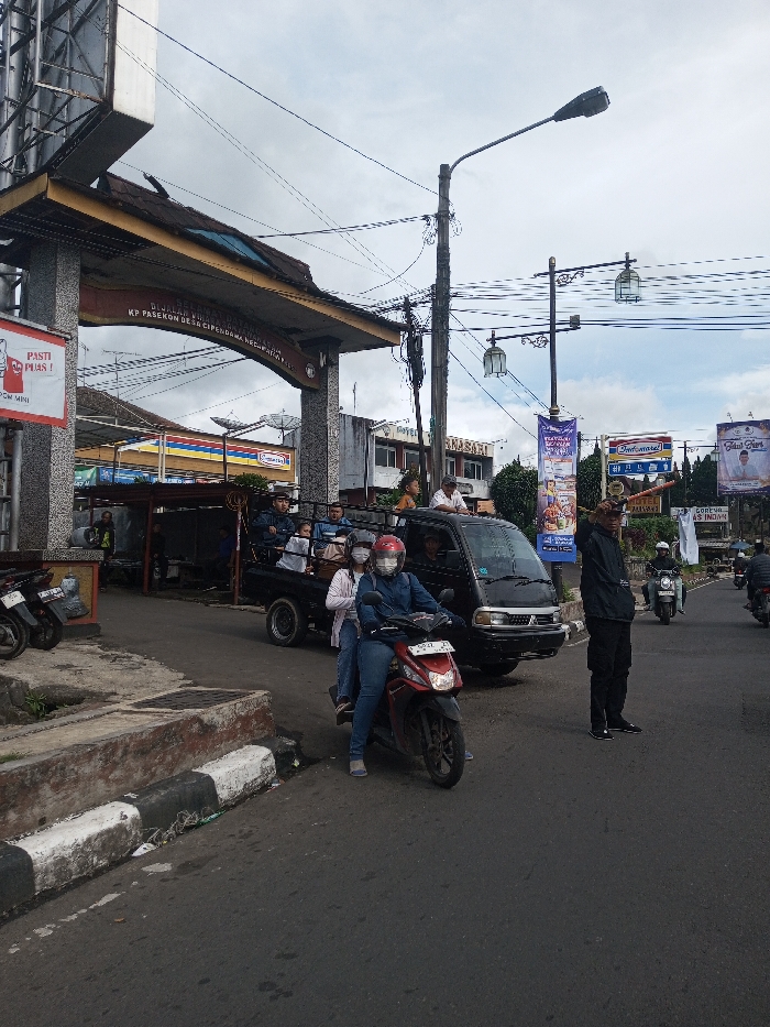 The image displays an urban street scene in Saing Ta Mawt Lay, Myanmar, under an overcast sky. In the foreground, a red and black scooter is stopped on an asphalt road. Two individuals are on the scooter; the driver wears a red helmet, a blue jacket, blue jeans, and a white face mask, while the passenger wears a light-colored top, blue jeans, and a white face mask. To the left, a concrete curb painted white and black is visible, along with a dark gray drain grate. Adjacent to the scooter, a dark-colored pickup truck with an open bed is stationary in the lane. The truck's cab is dark, and approximately seven individuals are visible within the open bed, some seated and some standing. The driver is partially visible inside the cab. To the right of the vehicles, a male individual stands in the road, facing right, wearing a black jacket, dark pants, and a dark cap. He holds a long, light-colored stick horizontally with his right arm, appearing to direct traffic. Further down the road, additional motorcycles and vehicles are present. In the mid-ground, a concrete and tiled archway structure with a damaged roof spans an entrance. A banner attached to the archway displays text in a foreign language. Behind this structure, a blue and yellow "Indomaret" sign is visible, along with parts of other buildings, one labeled "HOTEL SAMAN." The background features numerous utility poles with a dense network of overhead power lines. A large, dark streetlight extends from a pole in the center, and two decorative, lantern-style streetlights are visible further right. Multiple vertical banners, one blue with "Indomaret" branding and another depicting a portrait, line the street. The sky is uniformly gray with clouds.