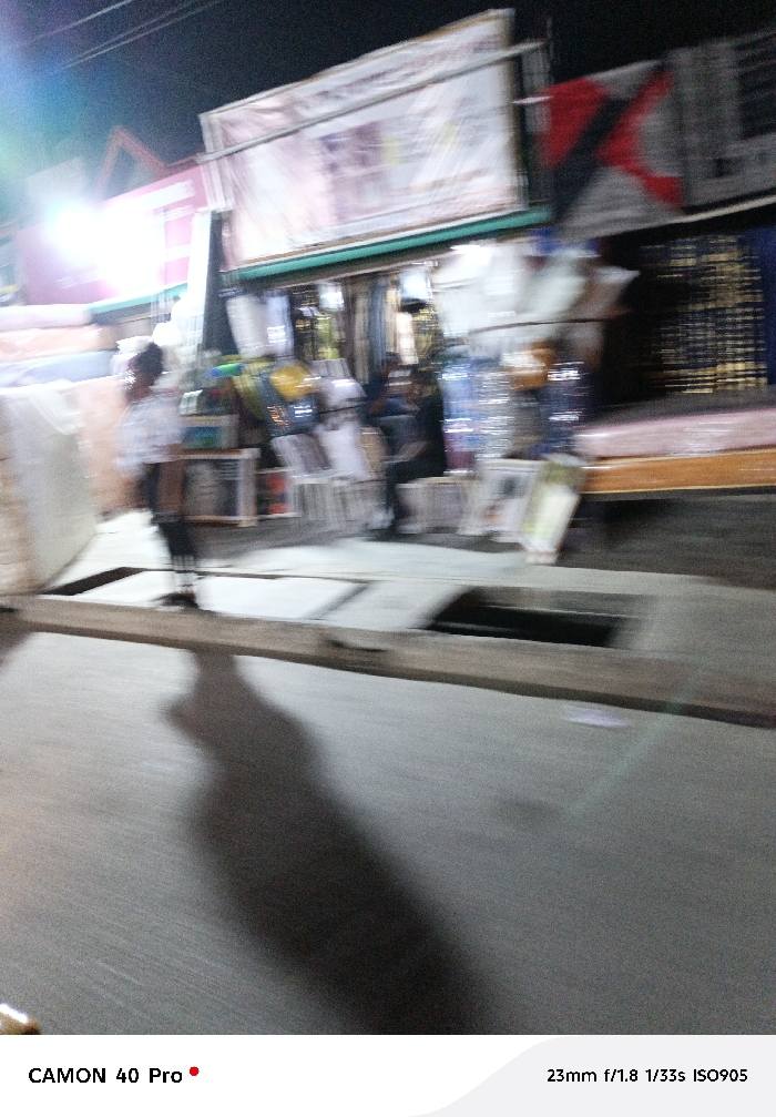 A blurred, nighttime street scene shows a storefront with a variety of goods displayed. The shot appears to be taken while in motion, resulting in strong motion blur. Figures are visible, including one possibly standing in front of the store and others seated inside. Shadow of the subject is showing on street. Banners and signage hang above the store. The camera and settings used are identified at the bottom of the image.