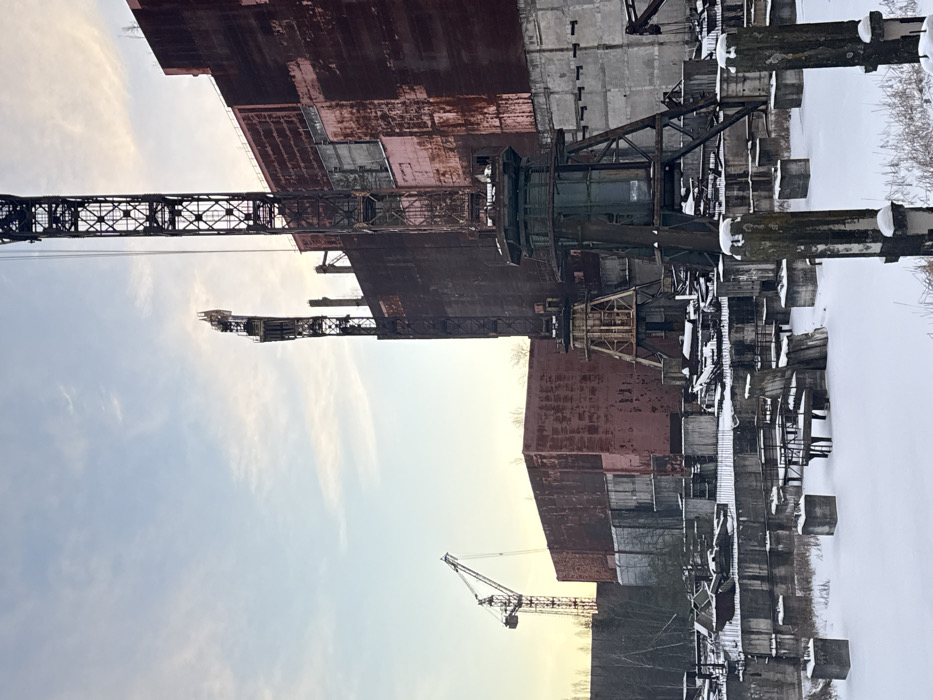 The image depicts an industrial setting with rusty, weathered structures and cranes against a pale sky. One large building has corroded metal panels. Several cranes with intricate lattice designs are visible. Concrete pillars and structures, some covered in snow, appear in the foreground. The scene evokes a sense of decay and abandonment in what was once a bustling industrial area.