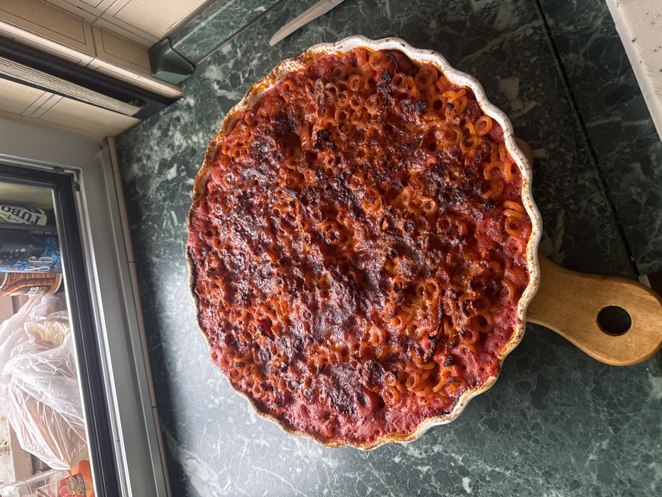 - "A circular baked pasta dish with a vibrant red tomato base and numerous small ring-shaped pasta pieces, some exhibiting dark, charred areas from baking, is centrally positioned in a white ceramic fluted baking dish with a light brown wooden handle" by FM-iCfSu2, licensed under CC BY 4.0