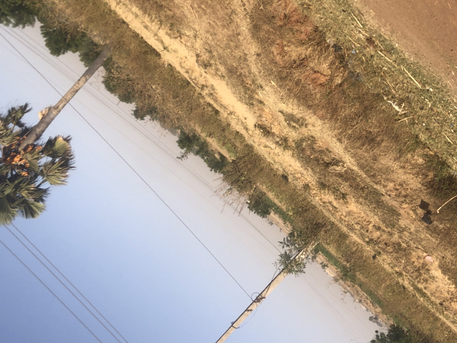 The diagonally oriented image depicts a dry, open landscape in Hanwa, Nigeria, under a clear, light blue sky. In the upper right quadrant, a solitary palm tree rises, exhibiting green fan-shaped fronds and clusters of orange-yellow fruit. Multiple thin power lines traverse the sky horizontally from left to right, with a light-colored electrical pole visible in the mid-left supporting these lines. The mid-to-lower portion of the frame comprises uneven, sandy-brown soil with sparse, dry, brown and green vegetation, including scattered small bushes and grasses. Minor undulations are visible across the terrain. Small, miscellaneous pieces of debris are present on the ground in the lower-middle and lower-right areas. A faint reddish-brown dirt path is partially visible along the bottom right edge. No human figures or specific activities are depicted.