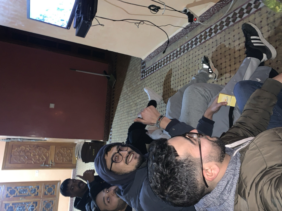 A group of five young men are indoors. They are seated on the floor, angled toward a television mounted high on the wall. Some are wearing hoodies and glasses. One man holds a yellow pack. Their footwear ranges from sneakers to Adidas. The floor has a patterned tile. There's a door with intricate wood carvings to the left. A broom leans against the wall near the television.