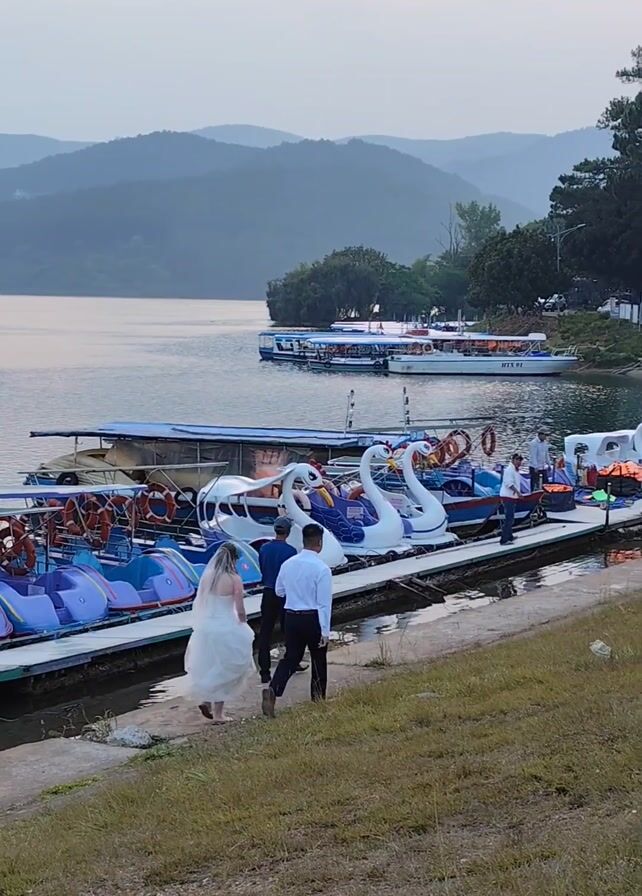 A bride and groom walk down a dock towards a row of swan pedal boats next to a lake. The bride wears a white wedding dress, and the groom is in a dark suit. They are accompanied by a man in a suit. There are other people on the dock near the boats. In the background, there is a lake, mountains, trees, and some larger boats. The sky is overcast.
