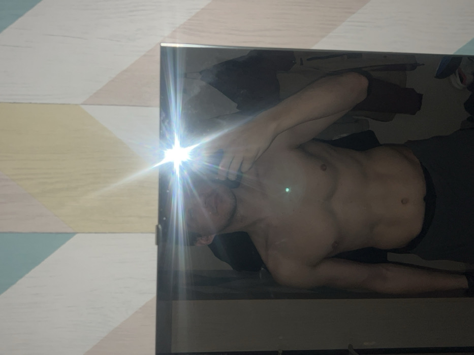 A shirtless man takes a selfie in a mirror. His torso and one arm are visible. He wears dark shorts or pants. The mirror reflects a dark room with clothes or other items. A bright light, likely from the phone's flash, obscures the man's face. A wall with a geometric pattern is partially visible to the left of the mirror.