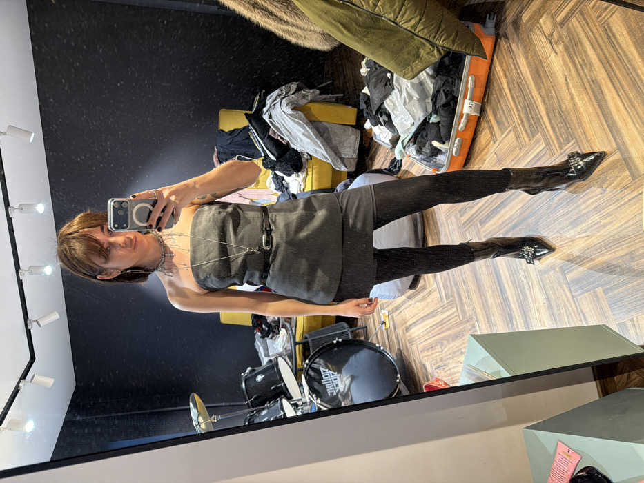 The image depicts a female individual taking a mirror selfie in an indoor setting located in Ust-Ilimsk, Russia. The individual, appearing in her 20s or 30s, has brown, shoulder-length hair with bangs and is wearing a strapless dark grey top cinched with a thin black belt, layered over a shorter dark grey skirt or tunic. She wears black opaque tights and pointed-toe black ankle boots featuring a decorative buckle. Multiple silver-toned necklaces, including a long chain with a pendant, and earrings are visible. Rings adorn her right hand, which holds a smartphone with a visible MagSafe case, angled towards the mirror to capture the reflection. The background, reflected in the mirror, shows a dark-colored wall, possibly black or dark grey, with a speckled texture. A drum kit, including a bass drum with "ROLLING ROCK" partially visible, is positioned to the left. A bright yellow sofa or armchair is situated centrally, heavily covered with draped clothing. To the right, an open orange hard-shell suitcase is filled with clothes. The floor is covered with light brown wooden planks arranged in a herringbone pattern, reflecting overhead lighting. The ceiling is white, fitted with several track spotlights. A light blue or green display pedestal is partially visible in the lower left foreground.