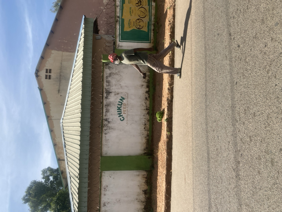 The image depicts a male figure walking from right to left across an asphalt road under a bright, partly cloudy sky. The individual wears a green t-shirt, light brown trousers, dark sandals, a red and white patterned cap, and a white face mask. He holds a dark object, possibly a phone, in his right hand. Immediately behind the road is an unpaved dirt strip with sparse green vegetation. Behind this strip stands a white perimeter wall with a green base and vertical green accent stripes. The top of the wall is secured with razor wire. The wall features "CHIKUN FEED" painted in green, accompanied by the slogan "for healthy growth & optimal vitality." Further to the right on the wall, additional "CHIKUN" branding, possibly depicting product bags, is visible. The wall shows signs of dirt and weathering along its lower section. Behind the wall, a building with a light-colored corrugated metal roof is visible. Further back and to the right, a larger, multi-story building with a reddish-brown facade and two square vents near the peak of its gabled roof stands. Green trees are visible in the upper left background. The strong shadows cast by the figure and structures indicate direct sunlight. The presence of "CHIKUN FEED" branding, a division of Flour Mills of Nigeria Plc, suggests the location. This scene is situated near the Flour Mills of Nigeria Plc factory, specifically located at **Plot 354 Industrial Area, Jos, Plateau State, Nigeria.**