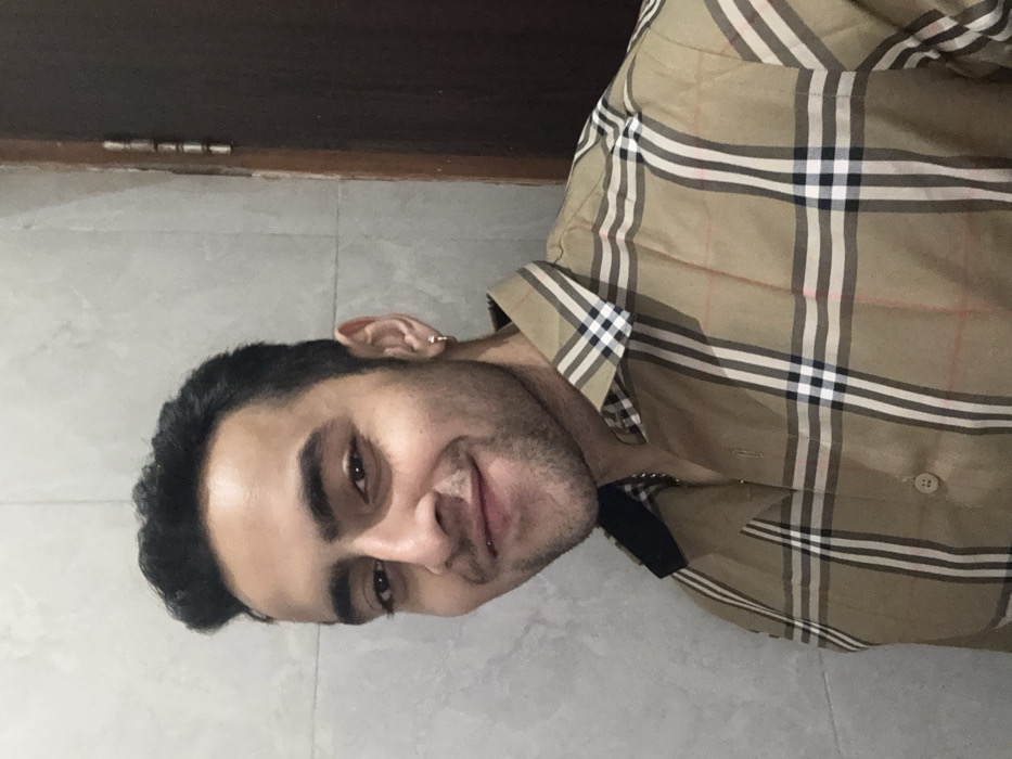 A man poses indoors, wearing a Burberry-patterned shirt. The shirt has a beige base with black, white, and red lines forming a plaid pattern. He has dark hair, an earring in his ear, and a slight stubble. The background includes a gray tiled floor and a dark brown wooden surface near the top. The image is rotated sideways.