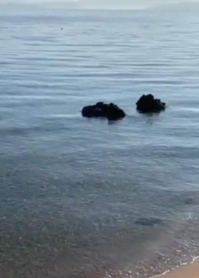 calm beach. The water is clear and shallow near the shore, with small waves gently lapping on the sand. Further out, two dark rocks are visible in the water. In the distance, mountains can be seen on the horizon under a clear sky.