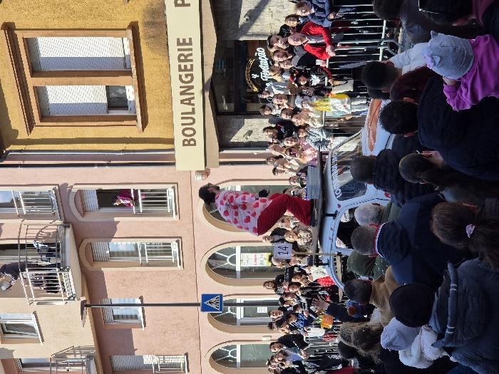 The image captures a crowded outdoor event on a sunny day in Pétange, Luxembourg. A male performer with dark hair and a beard, dressed in a white shirt with red hearts and red pants, stands balanced on a wooden platform secured to the roof of a white vintage-style car. The car features heart decals and text, partially legible as "TOMBA D'ORO," and a pole displaying the number "14." A large crowd of spectators lines the street, with a dense group in the foreground viewed from behind, and another crowd behind metal barriers to the right, facing the performer. In the background, two multi-story buildings flank the scene. The building on the left, with a light pink facade, shows an individual on a second-floor balcony holding a reflective object, and a woman in a pink jacket leaning from a third-floor window. The adjacent building on the right, with a yellow-orange facade, features a ground-level business identified by a prominent "BOULANGERIE" sign, with a partial "Tentação" sign visible above it. Sunlight creates strong shadows, indicating bright weather conditions. A black streetlight pole and a pedestrian crossing sign are visible on the left side of the street.