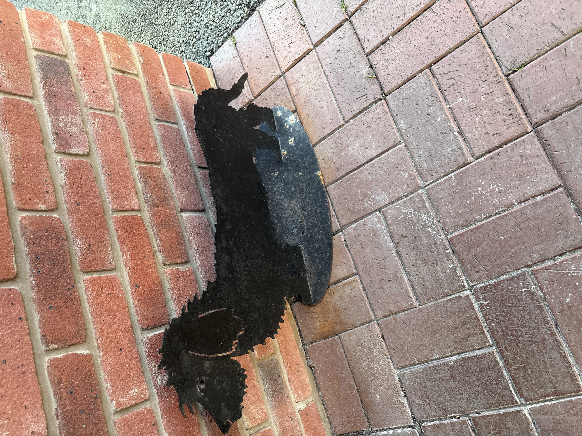 A top-down shot shows a black, corroded metal object with sharp, jagged edges on a brick surface