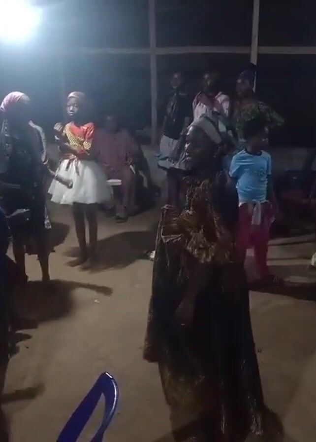 group of people, including children, gathered in a dimly lit outdoor space that might be a courtyard or open-air venue. The light source, possibly a bright bulb, is visible above, casting strong shadows. Children dressed in bright clothing, including a white tutu and a red-and-orange top, are standing and moving around, some appearing to dance. Some adults are sitting or standing, watching or participating in the gathering. The ground appears to be dirt or packed earth. Some chairs and other objects are scattered around the area. The video quality is somewhat grainy and shaky.