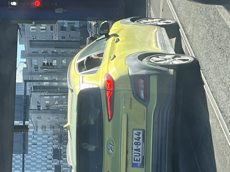 - "A bright lime-yellow Hyundai Kona Electric, bearing Finnish license plate EUA-844, is stationary on an asphalt road featuring tram tracks" by FM-bXvi43, licensed under CC BY 4.0