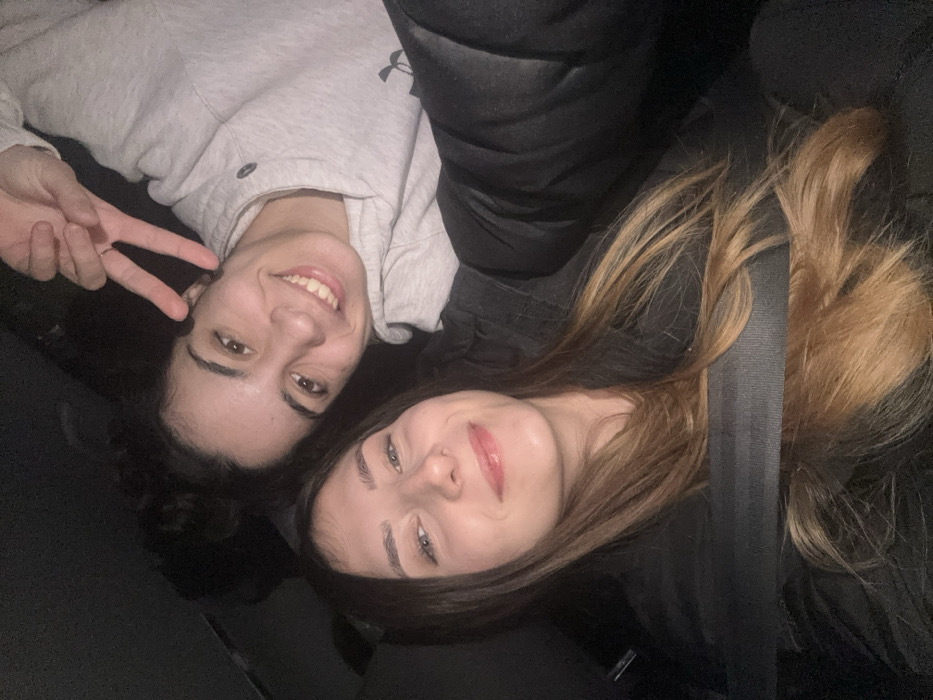 The image displays two adult females in a close-up composition, likely a selfie, within the dark interior of what appears to be a vehicle