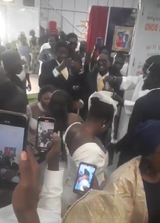 A group of people are gathered, many holding up cell phones to record a scene. The camera focuses on a man in a dark suit with a yellow tie, and a woman in a white dress. They are surrounded by other people in formal attire, some of whom are also holding up their phones to record. The environment appears to be an indoor event space with decorations visible in the background.