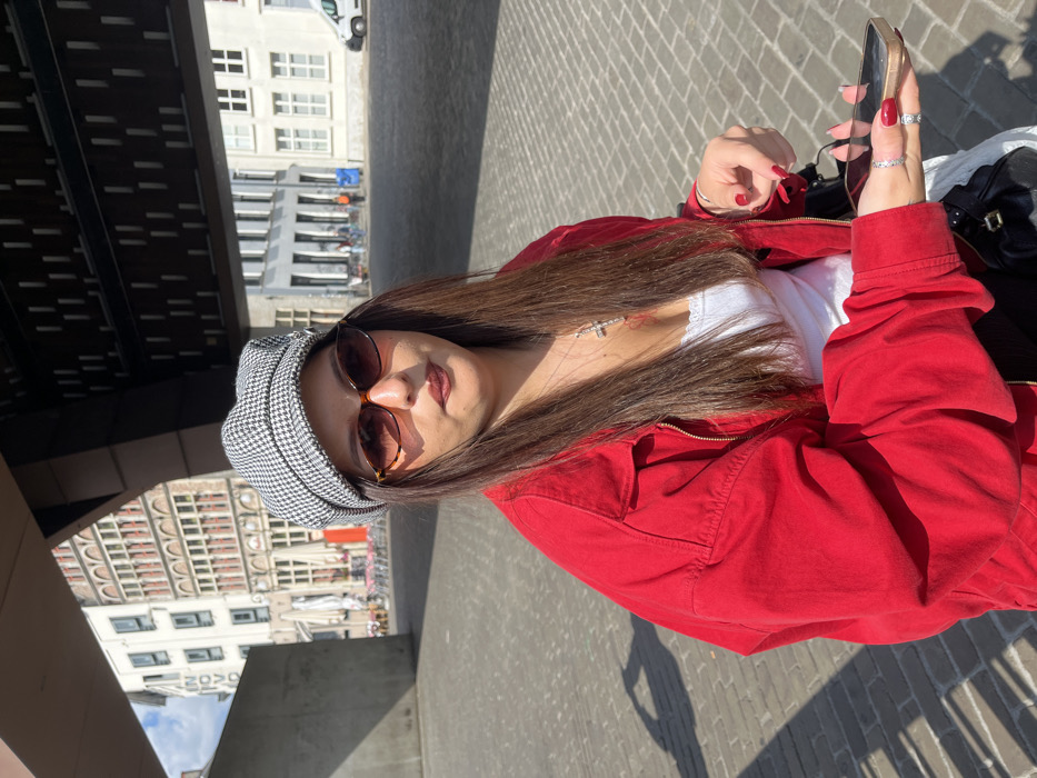 A female individual is positioned in a sunlit urban outdoor setting, likely under the modern, dark, angular substructure of Sint-Michielsbrug (Saint Michael's Bridge) in the city center of Ghent, Belgium. She has long, straight, dark brown hair, a medium complexion, and wears a black and white houndstooth flat cap, brown cat-eye sunglasses, a red collared jacket with a zipper, a white lace-trimmed camisole, a silver cross pendant necklace, and multiple rings on her fingers. Her fingernails are painted red. She holds a gold-cased smartphone horizontally in her left hand, which is extended slightly forward. Her right hand is relaxed. She is looking directly at the camera with a slight smile. The ground is paved with light-colored cobblestones or blocks, displaying strong shadows from the overhead structure and the individual. In the background, to the left, multiple-story historic buildings are visible, one featuring an intricate reddish-brown facade and another displaying the partial text "IN OVO." To the right, additional multi-story buildings and a white commercial van are present, with blurred figures of other pedestrians in the distance. The sky above is partly cloudy.