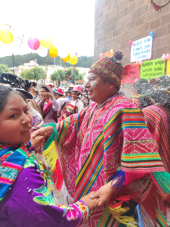A vibrant cultural celebration unfolds, showcasing individuals in traditional Andean attire. A woman in a purple sweater and colorful scarf holds hands with a man donning a red and multicolored poncho and a patterned hat. Confetti sprinkles the scene. Behind them, a crowd in festive hats gathers in a square adorned with balloons and signs in what appears to be the Quechua language. A stone building looms in the background.