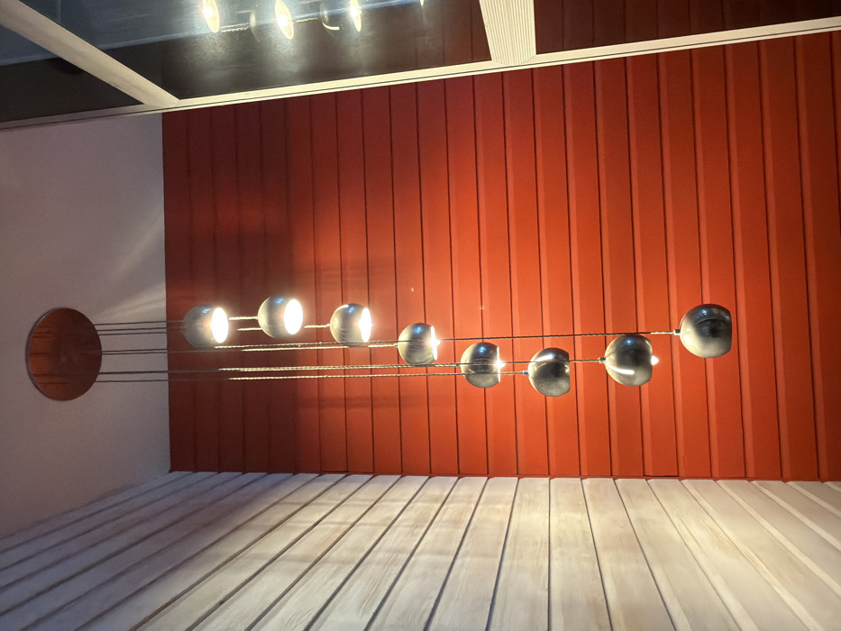 An indoor scene in Felixstowe, United Kingdom, depicts a modern multi-light pendant fixture suspended from a white ceiling. The fixture consists of a circular, metallic ceiling rose from which eight individual spherical, dark grey or metallic lamp shades hang at varying lengths via thin cables, forming a vertical cascade. Each shade emits an illuminated warm light source from its lower aperture. The background features two distinct wall surfaces meeting at a corner: a left wall clad in horizontal light-colored wooden slats, and a right wall clad in horizontal vibrant orange or red slats. To the far right of the frame, a vertical, light-framed reflective surface, likely a mirror or window, captures a partial, distorted reflection of the light fixture and the adjacent red wall. No individuals, specific actions, or interactions are depicted.
