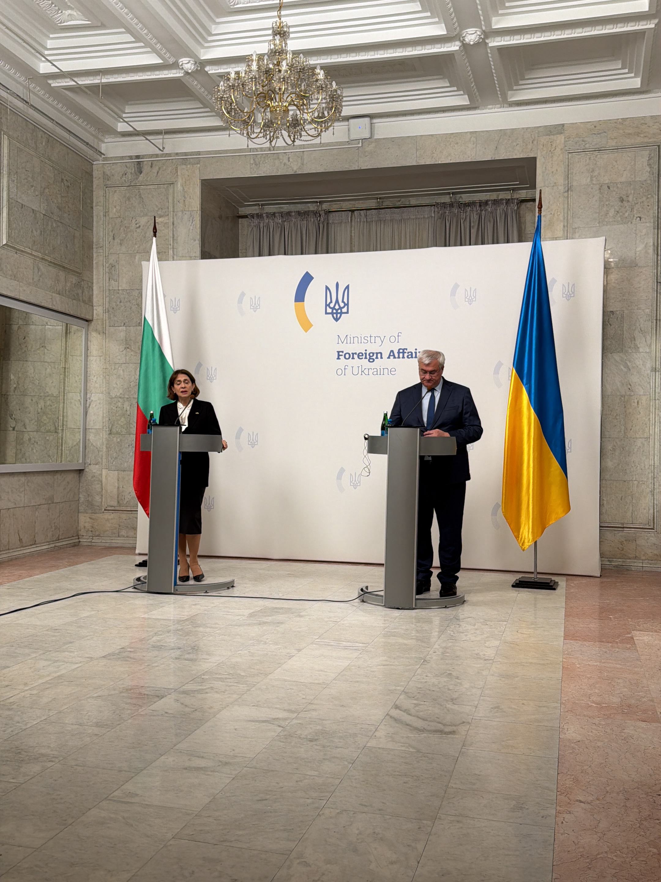 Two people stand behind lecterns with flags behind them in a formal room. The female is on the left, wearing a black suit. The male is on the right, wearing a black suit and tie. Behind them is a white backdrop with the words "Ministry of Foreign Affairs of Ukraine" written on it. The flag to the left of the woman is the flag of Bulgaria. The flag to the right of the man is the flag of Ukraine. There is a chandelier hanging from the ceiling. The room has marble walls and floors. Based on the backdrop, this scene is likely to be in Kyiv, Ukraine.