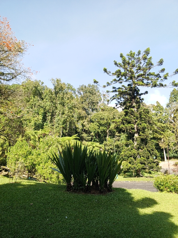 Lush greenery dominates the scene, featuring a dense assortment of trees and plants under a bright, clear sky. A cluster of tall, slender-leaved plants stands prominently in the foreground, rooted in a well-manicured grassy area. Behind them, a variety of trees rises, forming a dense forest backdrop. A towering coniferous tree with distinct horizontal branches punctuates the scene. A paved pathway winds through the landscape, adding a structured element to the otherwise natural setting.
