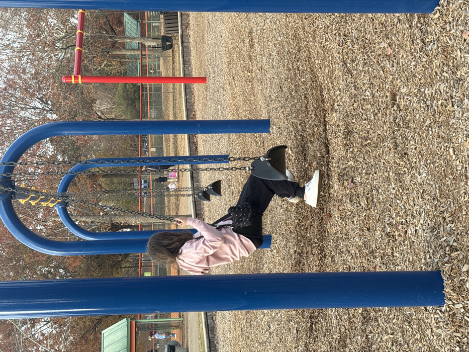A child on a swing set wears black pants, a light pink hoodie, and white sneakers. The swing set is blue. The playground surface appears to be wood chips. Another swing set with a red element is behind. Bare trees appear in the background.