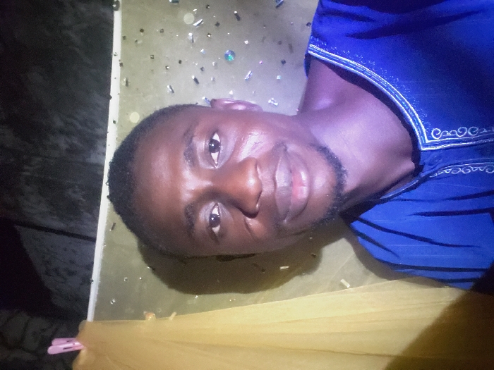 A man with dark skin and a short, dark beard looks at the camera. He is wearing a blue shirt with white detailing around the collar and down the front. There are small, shiny objects scattered around him. A pale yellow cloth and what appears to be a black wall are visible in the periphery. The lighting is somewhat dim and has a purplish tint, particularly on the man's face and shirt.