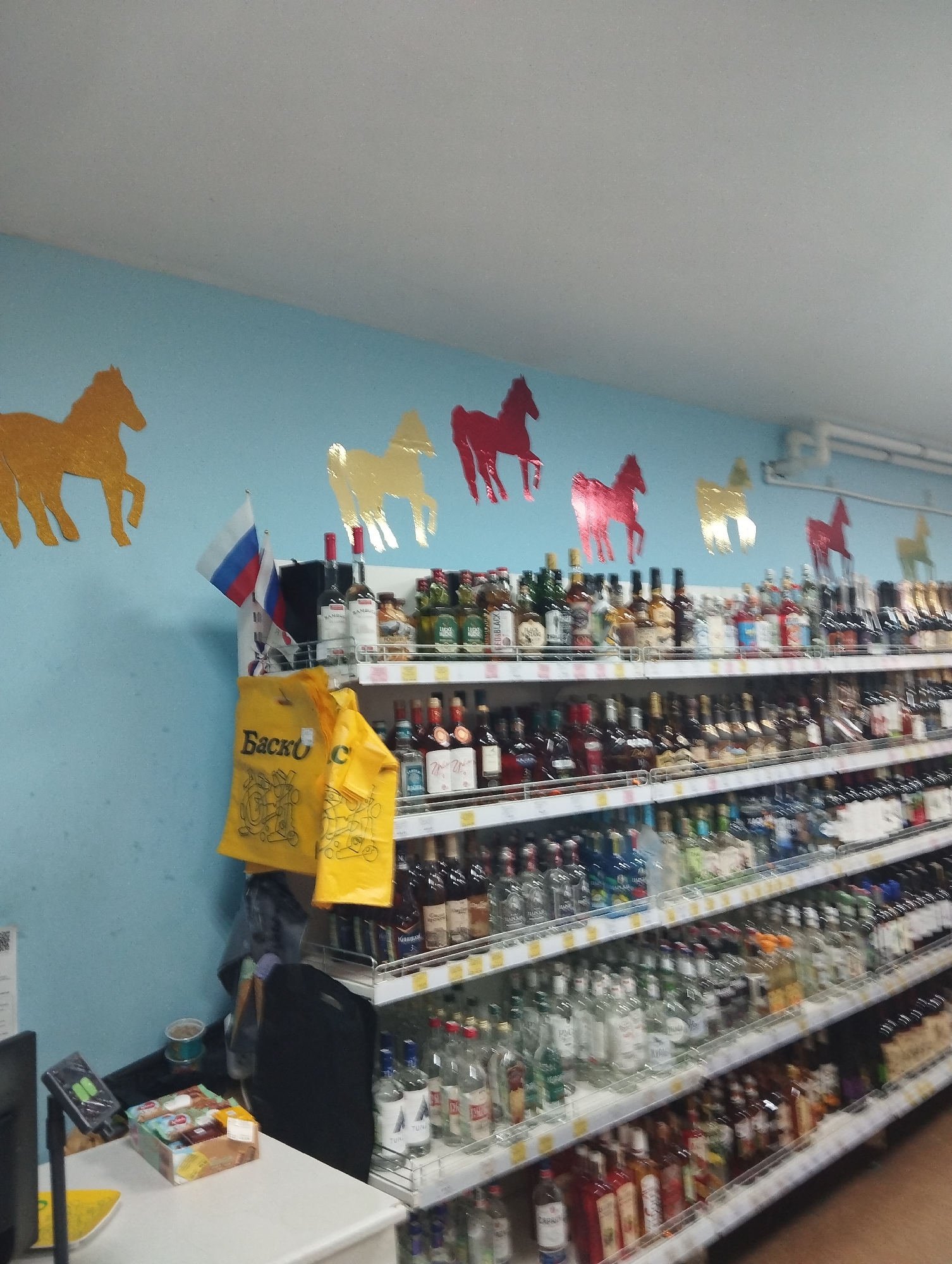 interior of a store, presumably in Krasnogorskoye, Russia, given the Cyrillic lettering on the "Баско" shopping bag and the Russian flag. The store appears to be selling alcoholic beverages, as evidenced by the multiple shelves stocked with bottles of various liquors and wines. Decorative horse cutouts, some in gold and others in red, are attached to the wall above the shelves. In the foreground, there's a checkout counter with a point-of-sale system, a box of pastries, and the aforementioned shopping bag. The overall lighting is bright. The room has a blue wall and a white ceiling.