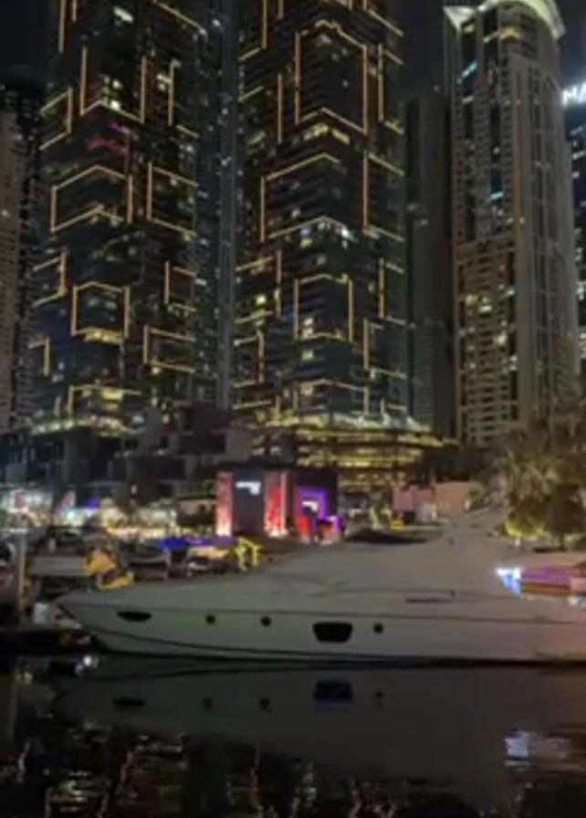nighttime view of a marina with a large, white yacht docked in the foreground. Behind the yacht are several skyscrapers, many illuminated with linear, golden lights. The water of the marina reflects the lights of the buildings. Some lights on the ground level near the marina are red and purple. Several other boats are visible in the marina. The scene appears to be calm and still.