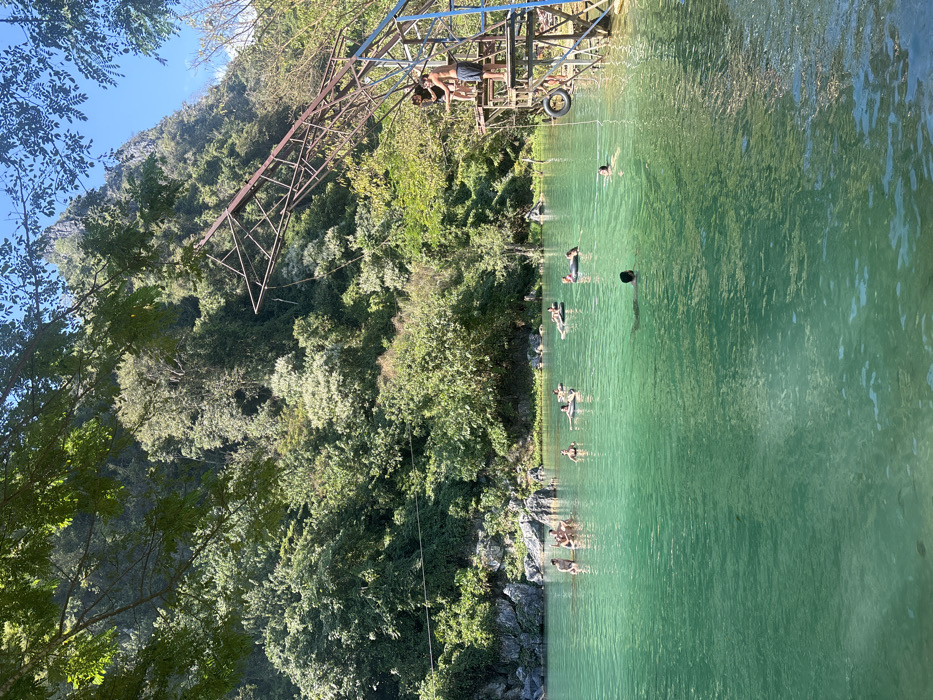 A turquoise lake is bordered by lush green vegetation and a mountainous backdrop. A metal structure with a ladder stands above the water, where a person is poised to jump. Several people are swimming and floating in the water. Sunlight reflects on the lake's surface, creating a shimmering effect.