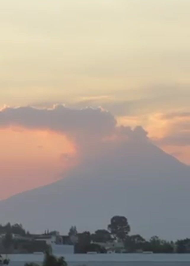 view of a mountain silhouetted against a light yellow sky with pink clouds. The mountain appears to be a volcano, with a cloud formation near its peak possibly indicating volcanic activity. The foreground shows rooftops and some trees, suggesting a populated area in the distance. The overall scene has a calm, scenic quality, despite the potential for volcanic activity.