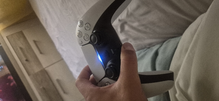 - "A right hand holds a powered-on white and black PlayStation 5 DualSense controller, indicated by its blue light bar" by FM-ht2ii1, licensed under CC BY 4.0