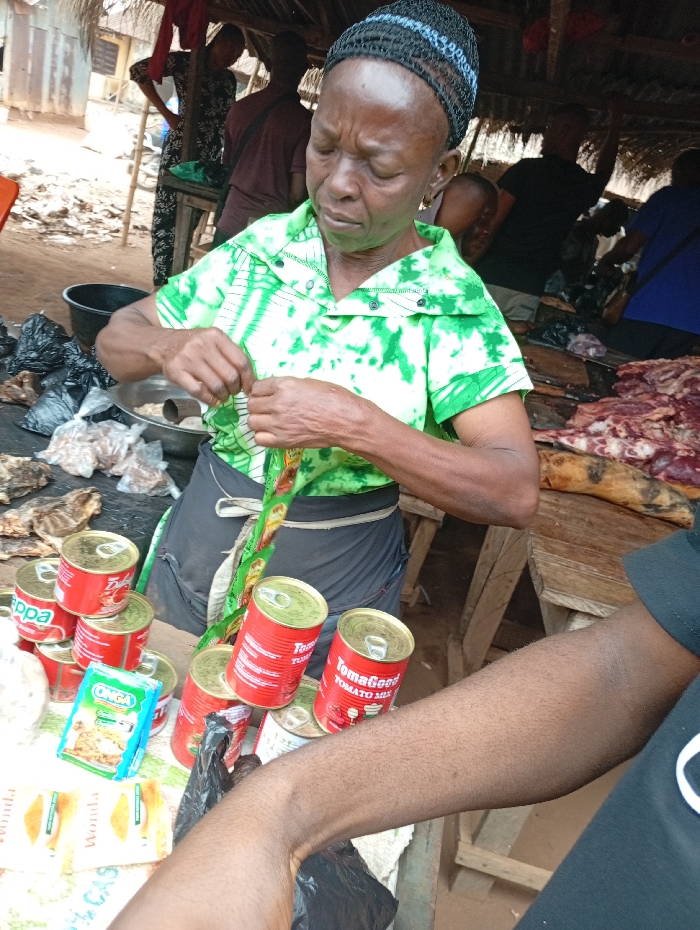 The scene depicts an active outdoor market stall in Omicha Umu Awada, Nigeria