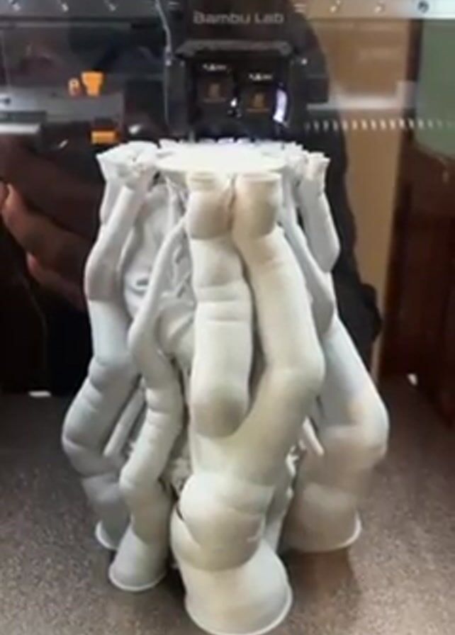 white, complex, 3D-printed object inside a Bambu Lab 3D printer