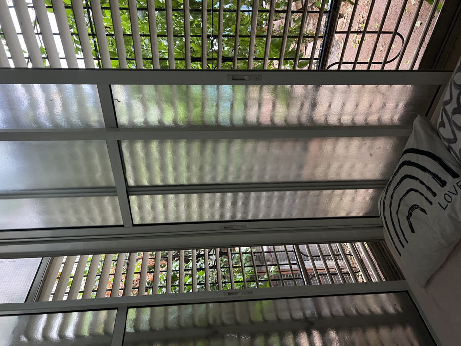 This image captures an interior view looking outwards through a multi-panel sliding window system in Givatayim, Israel