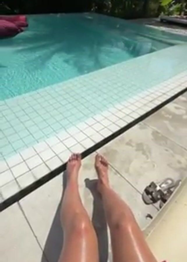 pair of tanned legs and feet extended toward a swimming pool. The person is presumably sitting or lying on a lounge chair. The pool is filled with clear, turquoise water, and a maroon-colored inflatable float is visible. The edge of the pool is lined with white square tiles. A pair of sandals are to the side of the person. Lush greenery surrounds the pool area. The sky is visible and appears to be clear and sunny. The camera angle is from a first-person perspective, looking down the person's legs.